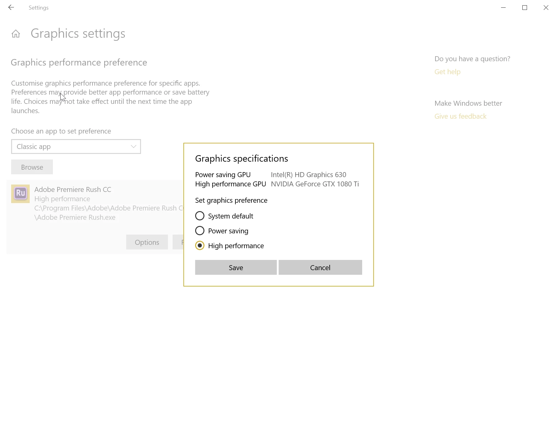 By default rush is using the intel graphics. I have a fully functional GTX 1080 that is NOT being used at ALL. How do I configure this?