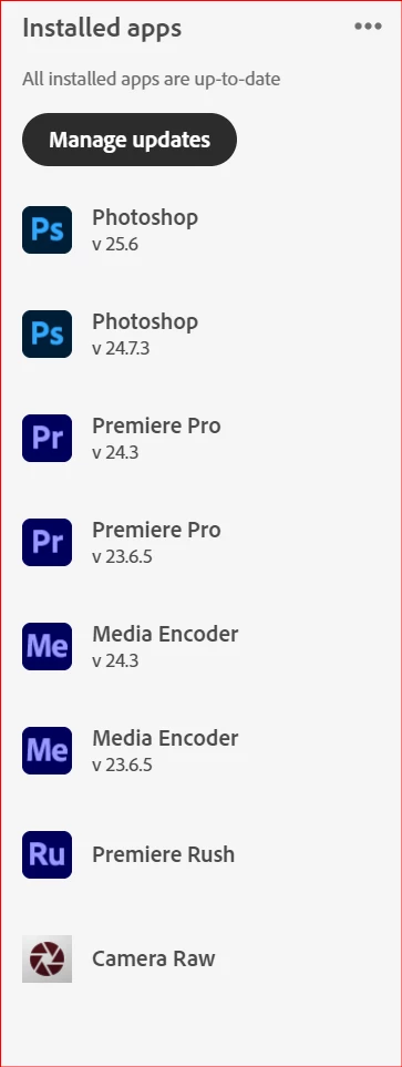 ** I did notice on my Creative Cloud Desktop and in my "Installed apps" box, out of all my apps, Premiere Rush and Camera Raw are not showing the version!!!! (see attached image)