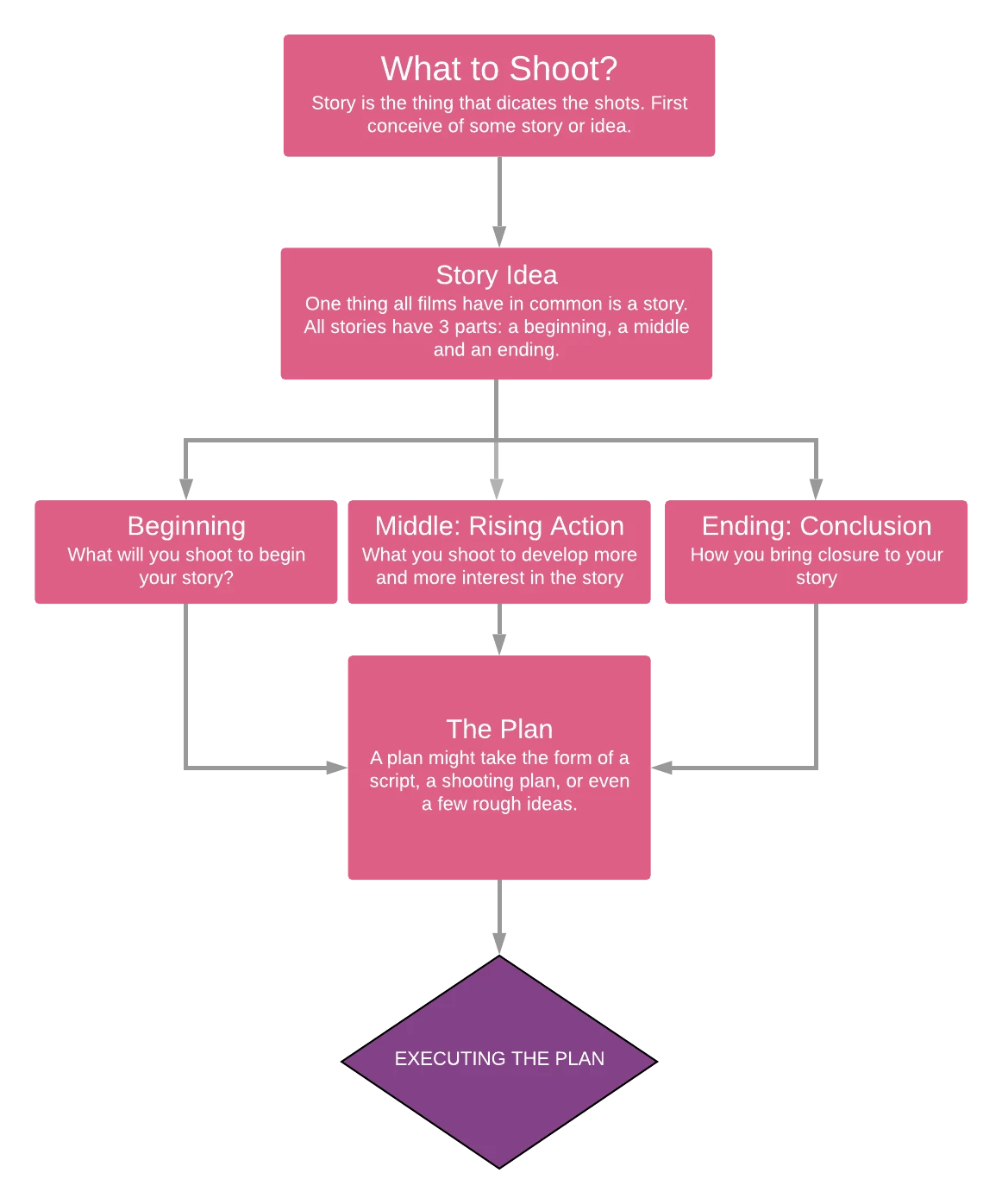 After you have an idea of how you are going to tell the story, I suggest that you come up with a plan or "brief." The plan might involve a shooting schedule, list of actors, locations, equipment list. shot list, a script, and a storyboard.