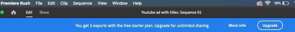 Online it says the Premiere Rush Starter is free and allows unlimited exports. My Premiere Rush Starter application when I open it says I only have 3 exports in the free starter plan and will need to upgrade to export more. This is frustrating, and I'm confused. I tried reinstalling the free version, but it still says I need to upgrade to export more than 3 times.