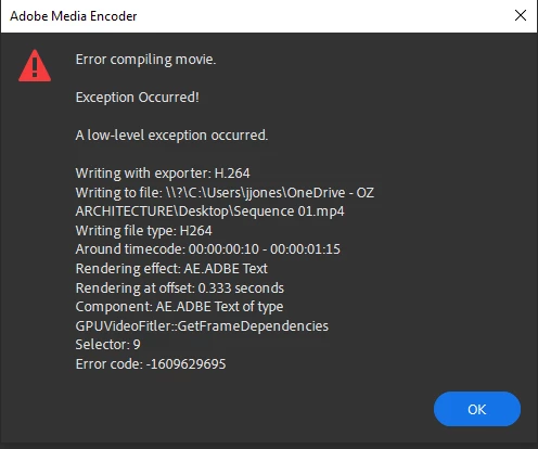 I've not been able to use animated titles in my timeline - the clips/stills will preview fine, but the screen goes black as soon as it hits the title in the timeline. This was confirmed when I tried to render; the error occurs right when the title should appear in the video. The rendering effect is AE.ADBE Text in the screenshot below.