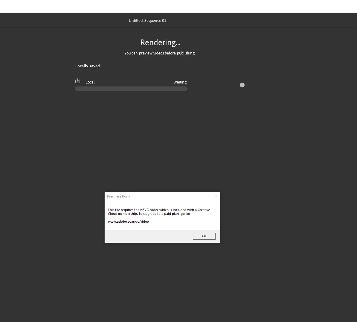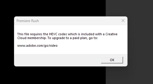 "This file requires the HEVC codec which is included with a Creative Cloud membership. To upgrade to a paid plan, go to..."