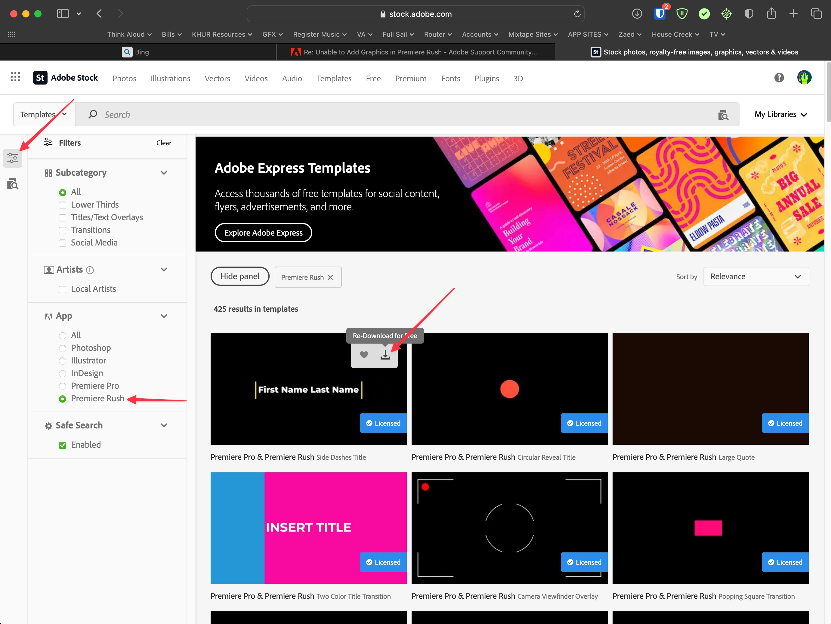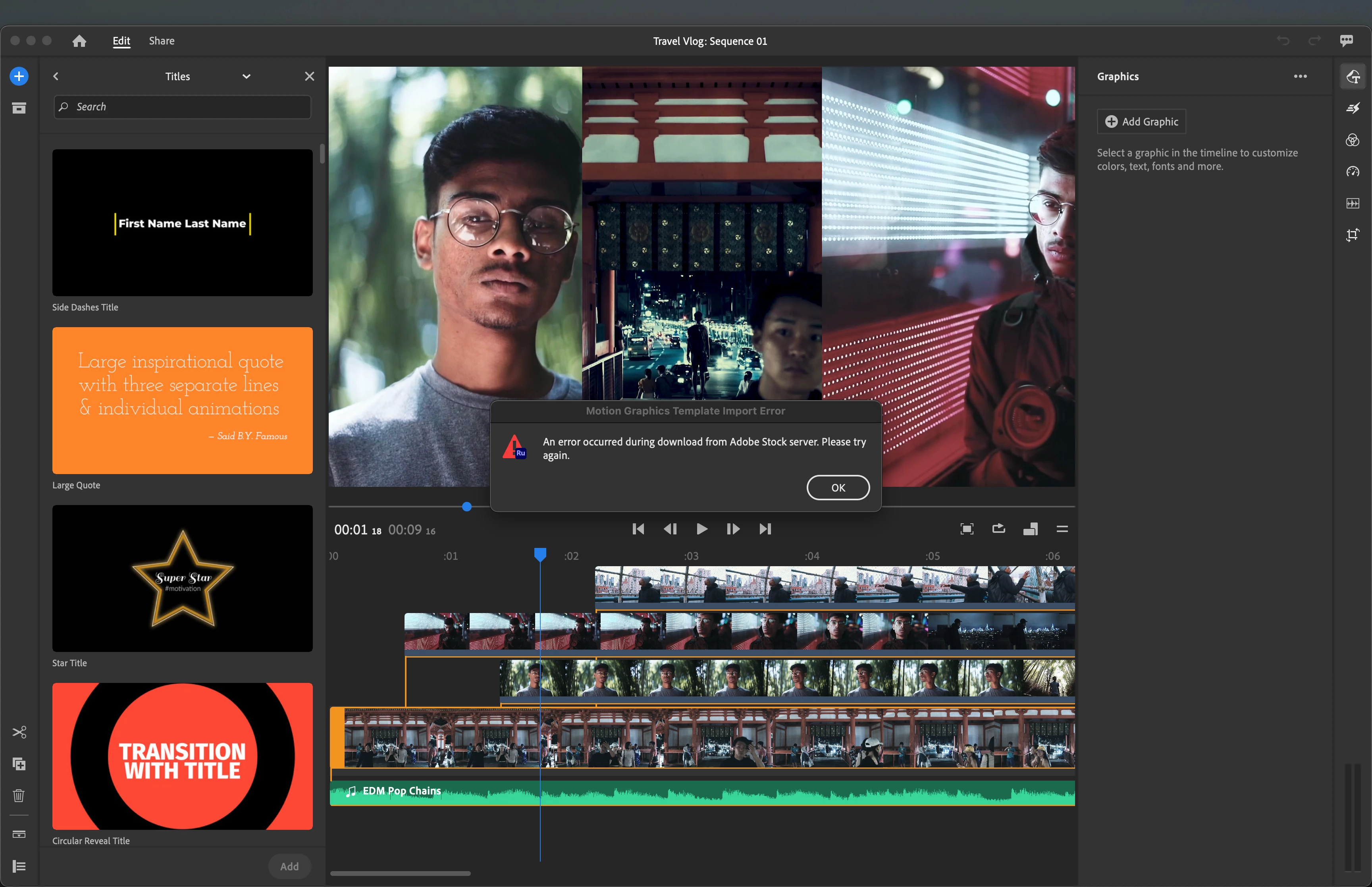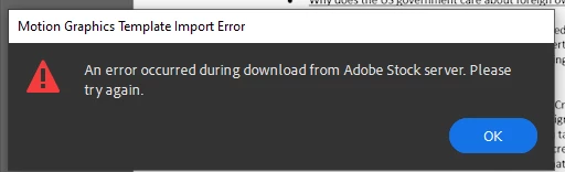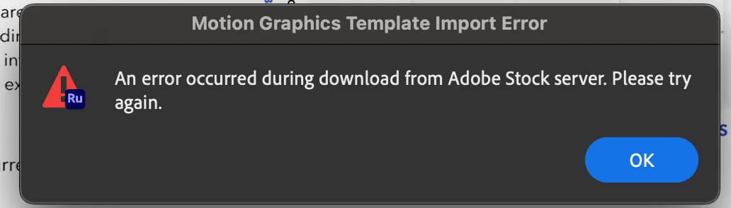 In the desktop app, when I click the blue plus sign to add Titles, Transition Graphics, or Overlays, I select the item (i.e. Basic Title 2-Line) I get the error: An error occurred during download from Adobe Stock server. Please try again. I have closed and re-opened Premiere Rush, and also signed out of my Adobe account and signed back in. Please help!