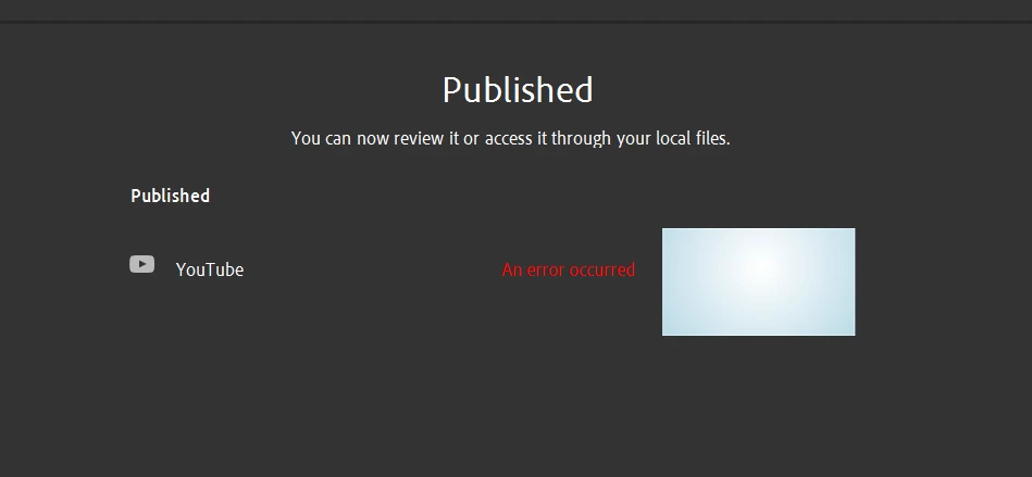 I am trying to upload to YouTube and I keep getting the message, "An error has occurred." It renders the video but when I try and submit the video I get the message. I have restarted the app and the computer.
