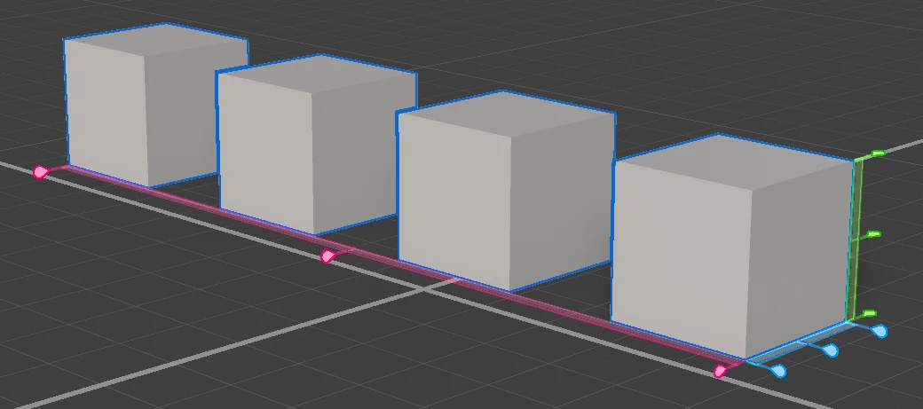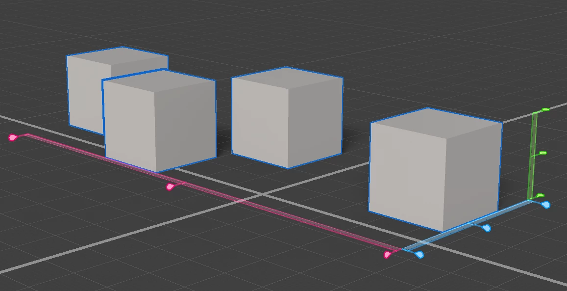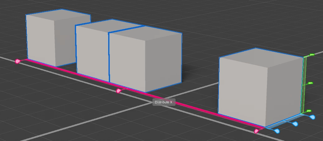 You access the Distribute function by hovering the mouse on the bar (not the tab) for the axis along which you want to distribute the objects. Here I'm hovering on the red (x axis) bar, which you can see has turned solid red. When I click, the space between the objects will be evenly distributed.