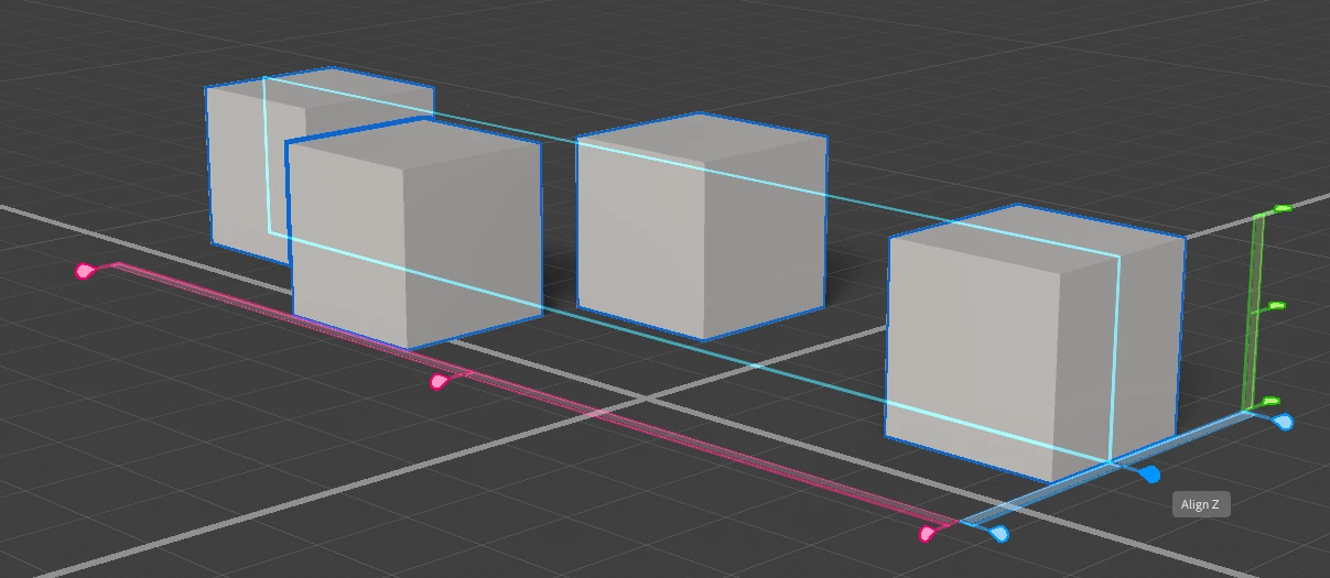 Aligning is easy. Hover the mouse on one of the tabs and Stager will show you how the alignment will go when you click. Here I'm hovering on the center blue (z axis) tab, which has turned a solid color. The cyan rectangle shows the plane on which the objects will align (on their centers, for a center tab, edges for the end tabs).