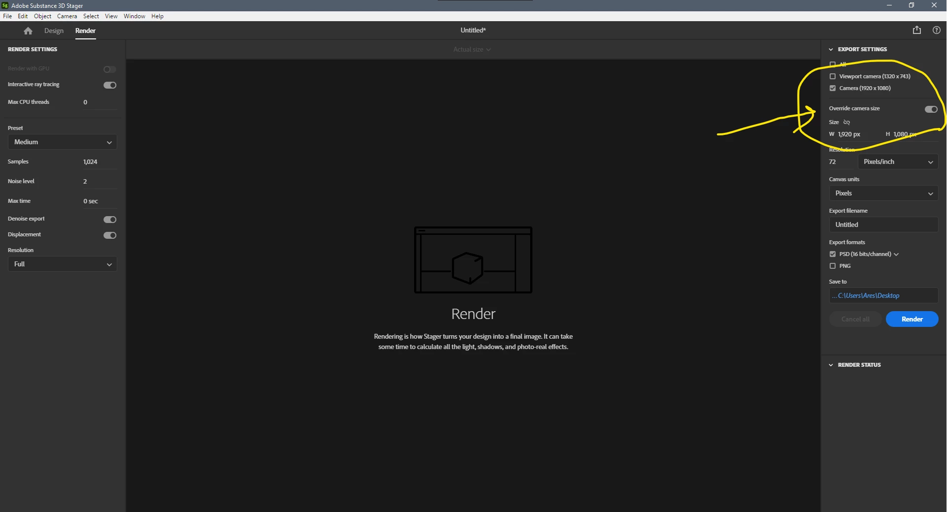 Properties > Camera > Size option is located here