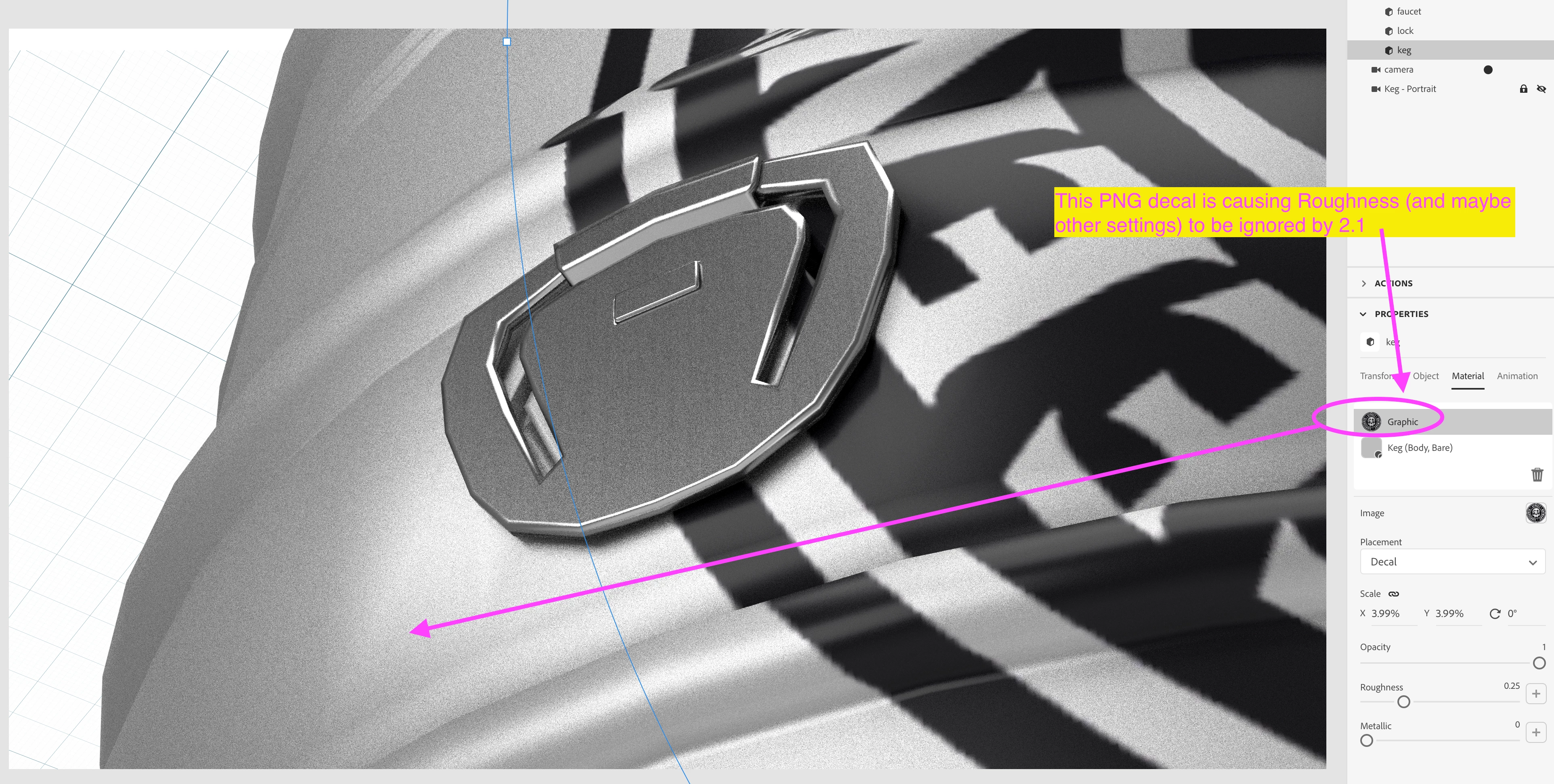 The weird thing is, if I'm creating a new project from scratch and import the same decal and the same mesh, the problem doesn't occur, it only appears with the specific file you sent me.
