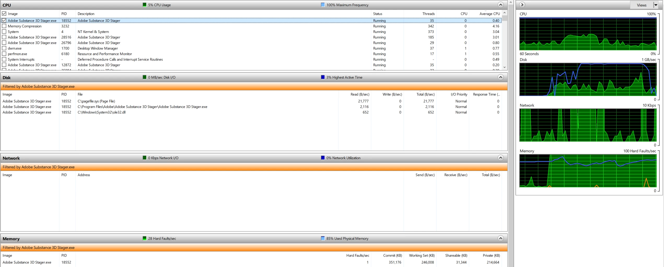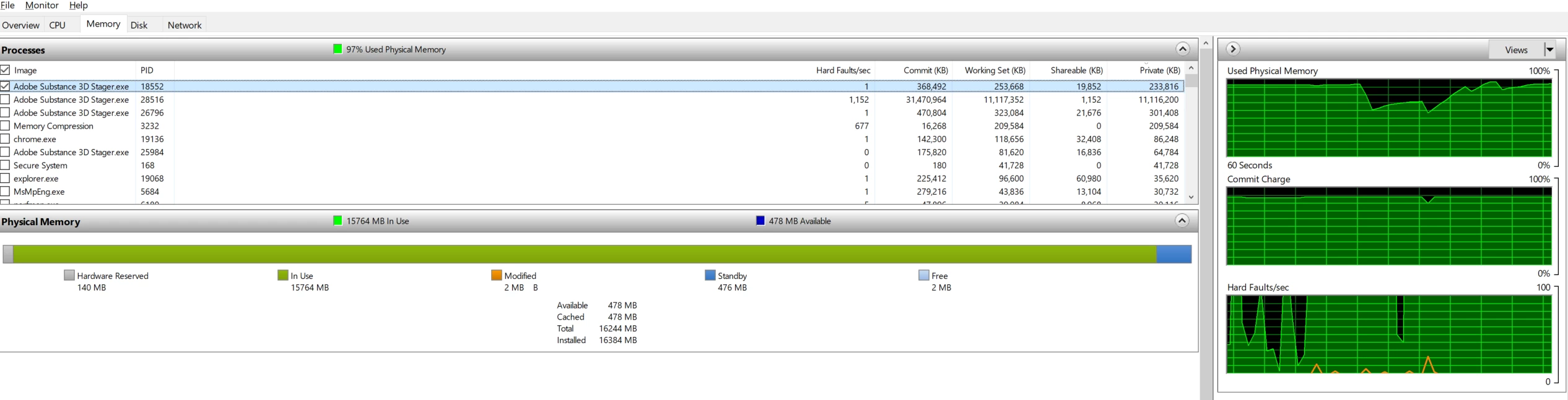 - Stager is a major memory hog. I added 16 cubes each with a material on them, mostly variations, but it uses 100% of my 16GB already. Seems like memory management could be better implemented in Stager for improved performance? With this much memory use it takes > 10 minutes to load this scene back up, constantly paging memory in and out!