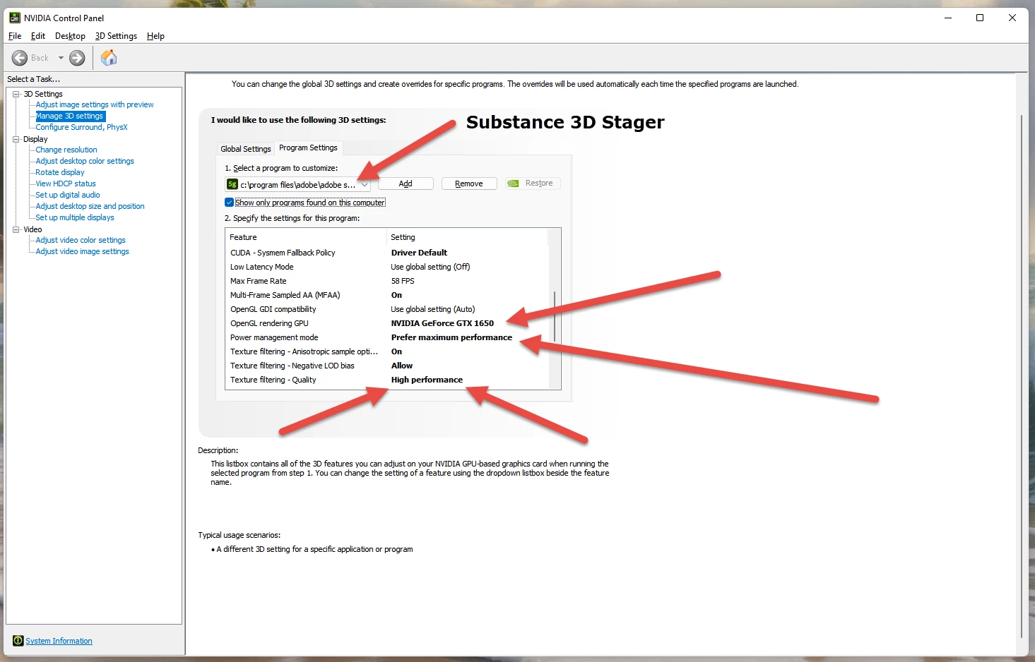 " Here is the solution, received from Marco and worked for me. Go to Nvidia Control Panel --> Manage 3D Settings --> Program Settings --> ADD  Adobe Substance 3D Stager on select a program to customize --> SELECT > High-Performance Nvidia Processor.  """