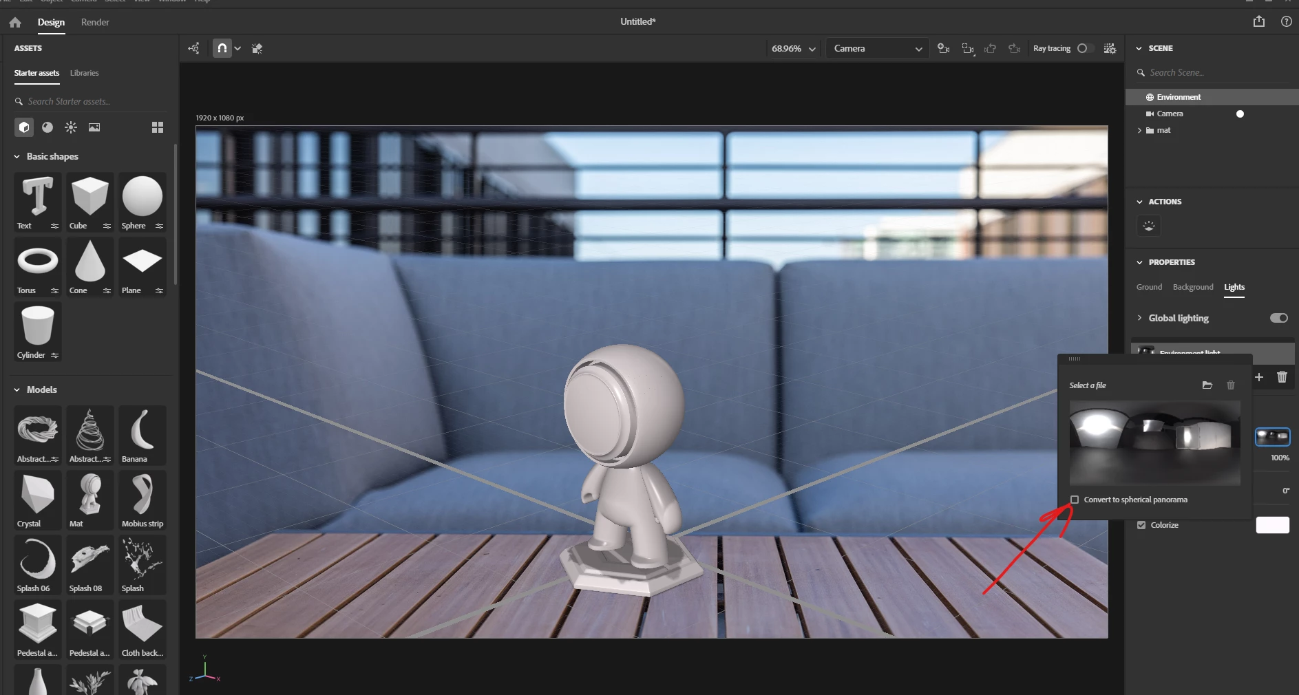 I then create a sphere hovering above the landscape, and now I need the sphere to glow and illuminate the landscape.