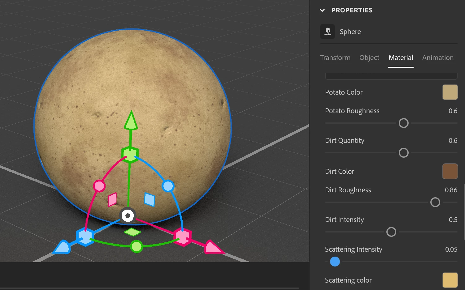 So I would like to create an image of a sphere with potato material. The lighting and the material should in principle look exactly like the example image, but I would like to have several variations of it, for which it would be enough to rotate the sphere. To achieve that, I installed Adobe Substance 3D Stager and downloaded this potato material.