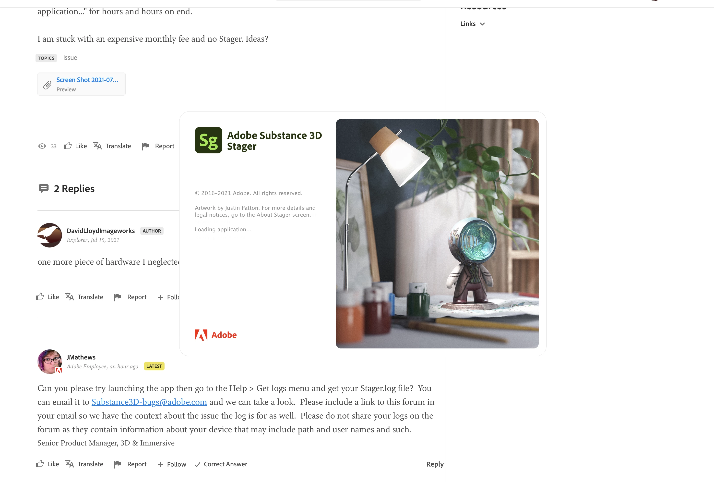 I had been working on a project in stager that I had brought over from Dimension (opened the dimension file in stager and then stave as stager file.sgg. I was working on modifying some materials applied to an object when the decals I had applied previously disappeared and a dialog box came up saying "A problem caused the application to stop working correctly"...