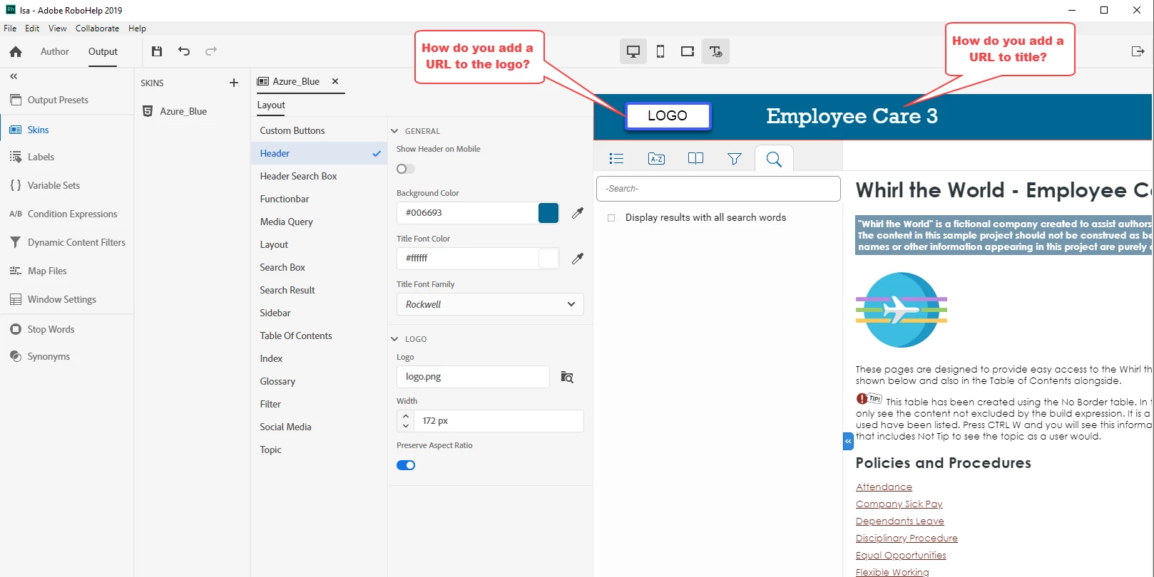 I'm sorry if this is an easy thing to do. I was able to do this in RH2017, but in RH2019, how do I add a URL to the logo and the title in the Header for Azure_Blue skin? Please see screenshot below.