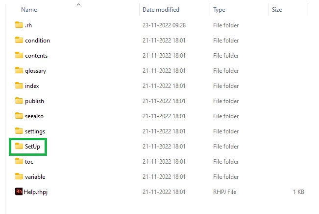 4. Now, I am working on help.rhpj. I want o add a hyperlink to a topic that is in the "Setup" folder.