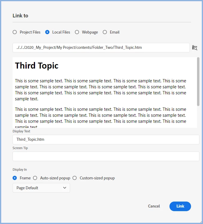 6. Now in the 2022 version, I used "Local file" option and added the link, and linked it . While linking, it showed me the correct topic as well (attached is the screenshot). The link is missing, every time when I click Edit hyperlink option to verify.