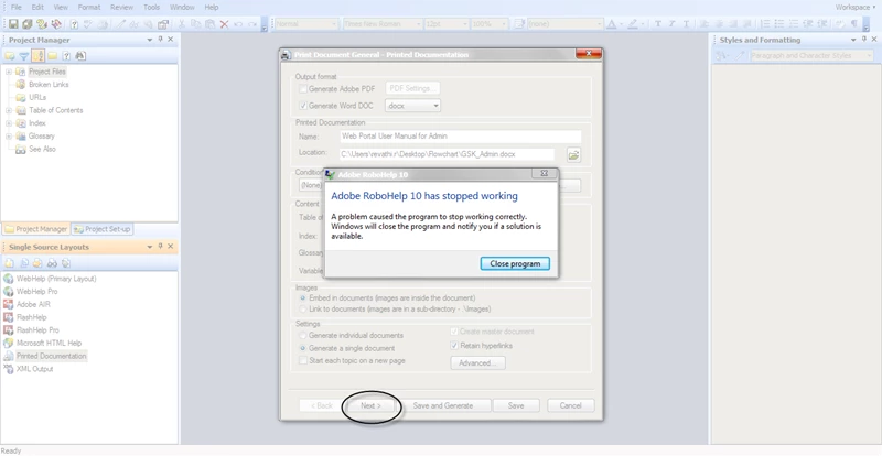 The problem is when I click Printed Documentation and click Next in the Printed Documentation screen, Rh crashes.