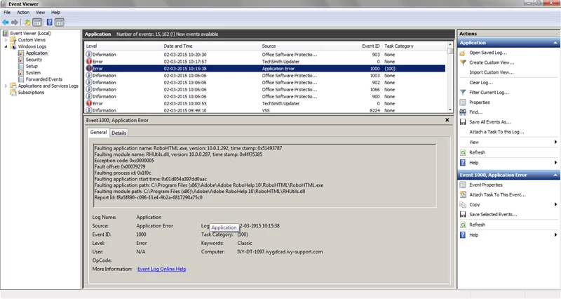 When I check the event log, I see Application Error. What exactly is causing this crash? Please help.