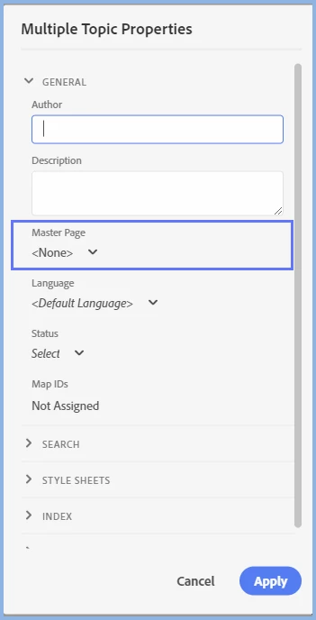 Applying a Master Page to all topics in a project in Robohhelp 2019
