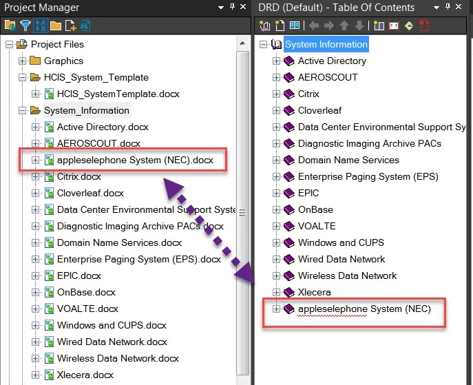 I then deleted "Telephone System (NEC).docx" from my project, including all the HTML files. I went to the directory that contains that Word document and renamed it and then re-linked it to the RoboHelp project. When I dragged the folder to the TOC designer, it put the book at the bottom of the TOC: