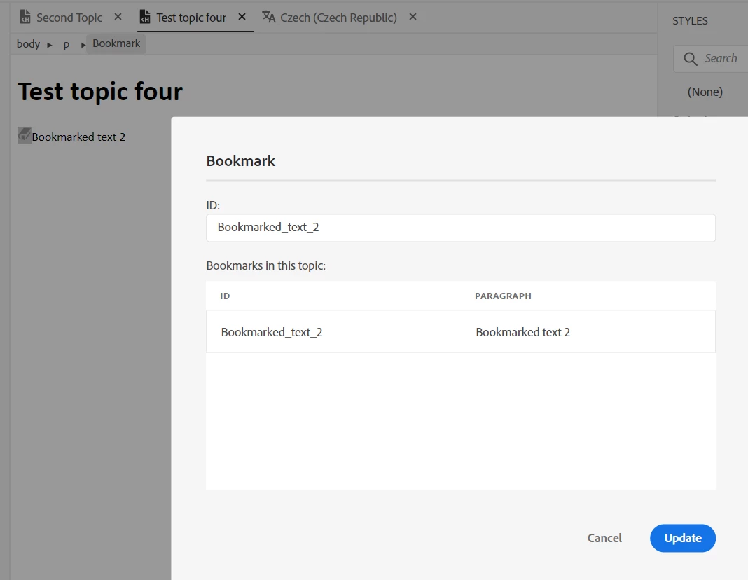 1 - Create a topic with a bookmark (no text associated with bookmark in this case, but the same happens if you bookmark text)
