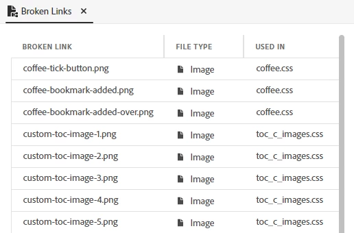I used to have clean reports on the broken links. Now, I am seeing some issues with the Coffee skin and custom-toc-images. I don't use the Coffee skin; I toyed with it once then abandoned it. My new output preset was created after I decided against using Coffee. I cannot find any reference to it within any of my files. I don't know why the output reports broken links to custom-toc-images. I'm obviously not looking in the right places.