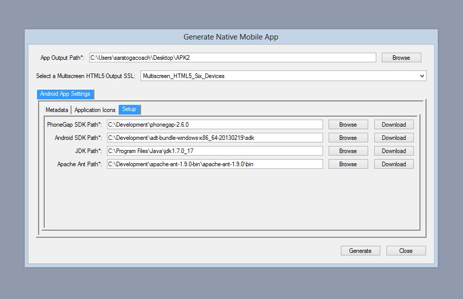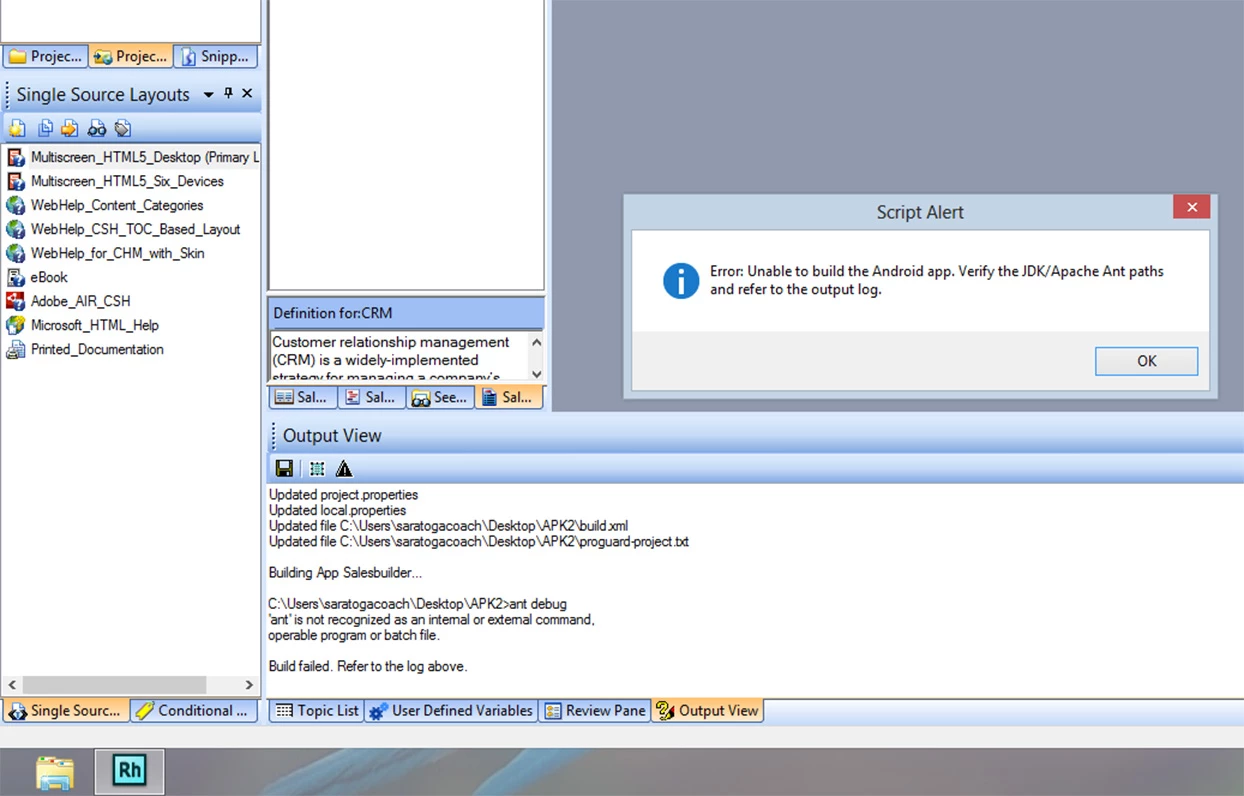 I'm trying RH10 on a Win 8 x64 system, trying to get the generate for mobile devices, Android to work. I've installed the Android SDK (part of the complete ADT) in a "Development" folder in the C drive, installed JDK for Win 64, added the PhoneGap and ANT unzipped folders to the "Development" folder and then in the RH10 dialog to generate the Android APK, I've pointed set the correct paths to these tools. (All installed tools are correct for my OS, Win 8 x64.)