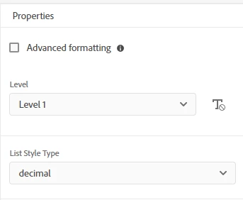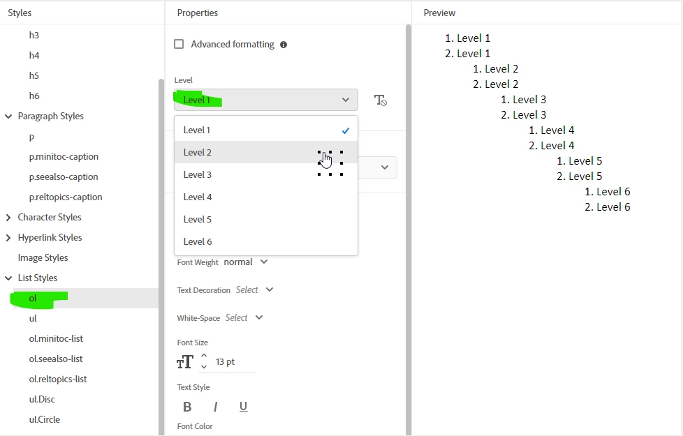2. I am not getting advanced formatting checkbox, level, list style type option when trying to create a new style or trying to duplicate the ol, ul style.