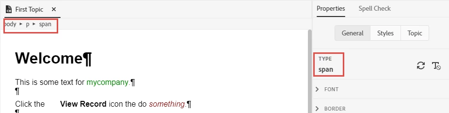 The element structure bar at the top of each topic can come in handy if you can't seem to access the fomatting settings that you're after. It shows you the order of elements for where your cursor currently is. You can then click on one of the parent elements to select it, and access the inline formatting options. For example, in this screenshot my cursor is inside some bold text. The structure bar shows that the cursor is inside a span which is inside a p tag inside the topic body tag. Mostly you shouldn't need to use it, but it can be helpful in some situations.