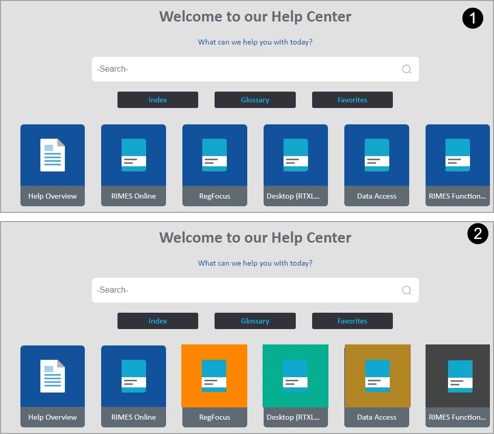 With FM 2019, I used the Publish feature to publish my Help to a Responsive HTML5 output skin called Indigo. I customized the skin's buttons and set the text colors to my company's brand via the Settings.sts edit function. Output looks great, so far so good. Each TOC item (icon) picked up a heading 1, cool. Now my manager wants me to customize the color of each icon (product line) to coincide with the brand product colors. I dont see a way of doing this with the FM Publish editing tools, which allow you to customize the TOC icon colors as a group, but not individually. Potential solution - RoboHelp 2019. I'm thinking the RoboHelp tools may enable me to go this extra mile in skin customization. Is there a way to import my finished Help into RH and then do this fine tuning edit on the Indigo Responsive HTML5 skin? My goal here is pretty simple, customize the individual TOC icons, as seen in the below example, from image 1 to image 2: