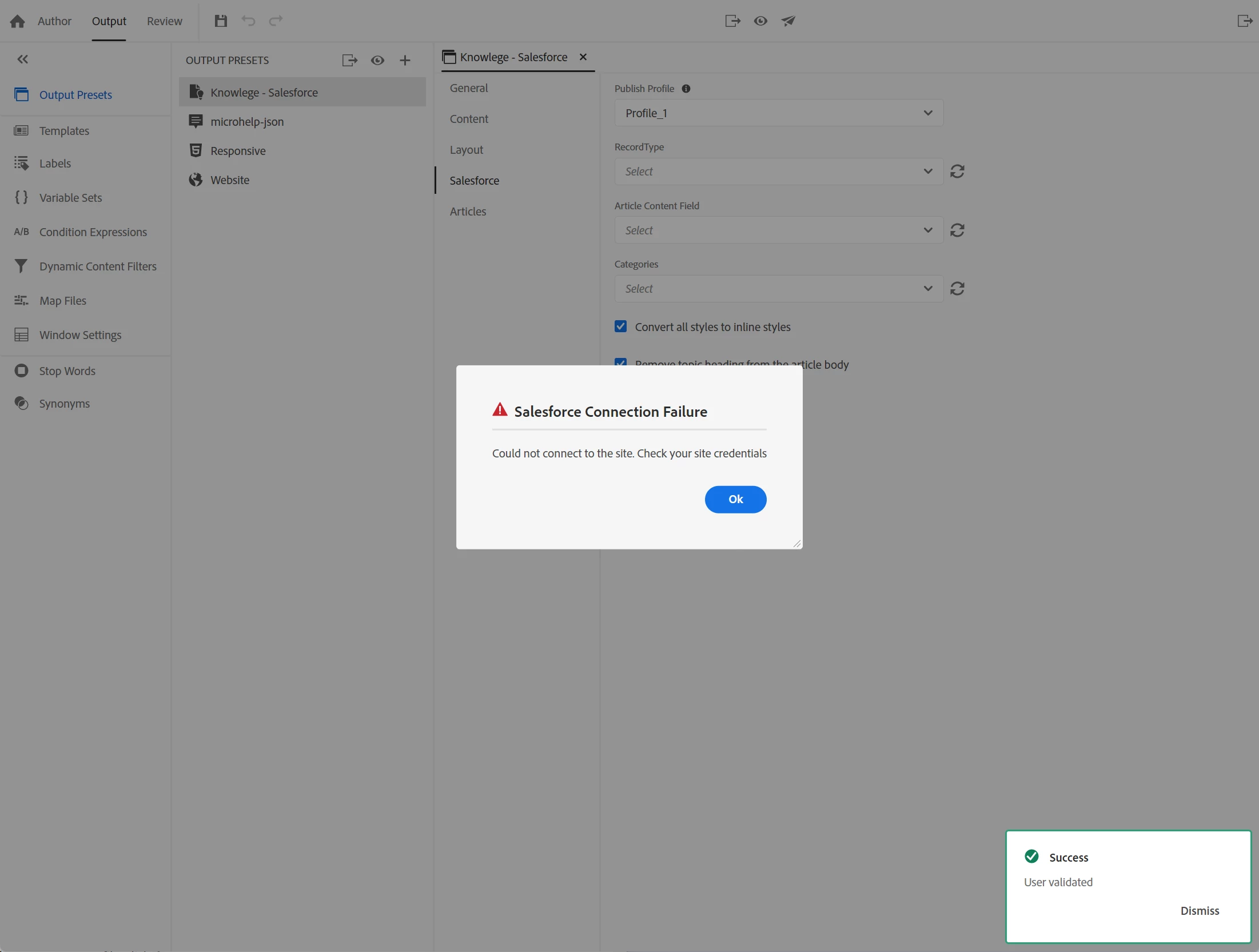 Then I go to create the output and I get the same conflicting error messages (see screenshot).