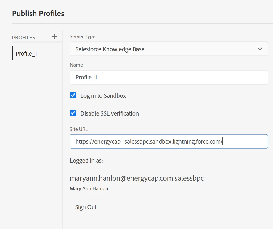 I am able to set up a publish profile and the window says I am logged in. I get a message in the lower right-hand corner but then I get an error in the middle of the screen.