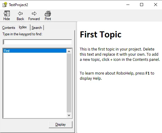 - I then click on the + sign in the Index panel and type in "Second" (ie a second keyword) after eventually getting it to the root level, then select the new keyword and add a Link to the "Second Topic" similarly to the way I did it for the first one, save all, regenerate the CHM preset output, launch it, and see this:
