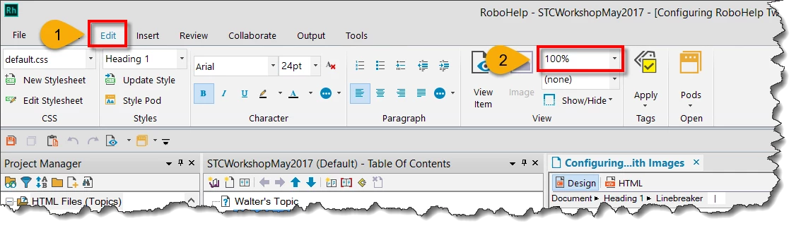 When I upgraded my RoboHelp last year to the most recent version, and tried to adjust my workspace to something I was comfortable with, the topic pod went full page and now stretches across the whole window. Any pods that I add to the workspace lay over the topic pod so that I have to scroll over to view all my text (you can see scroll bars and text running behind the pod in the workspace making you have to scroll to view text, and when typing it seems to go on and on with the text going off the page until it decides to wrap around to the next line).