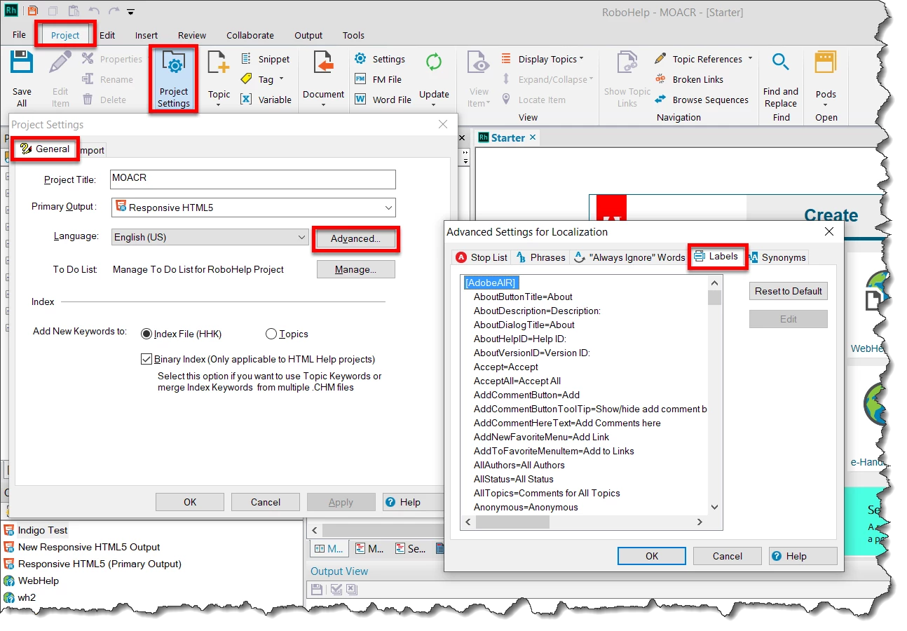 I'm using HTML5 for a merged project (one parent and many many children). The header displays a "Click here for Table of Contents" link in the upper right corner. I (along with others in my group) would like to change the link's text since clicking that link opens more than just the TOC. I don't see a setting in RH (using 2019 Classic) that allows me to change it. Is there a source file I can change? Thank you!