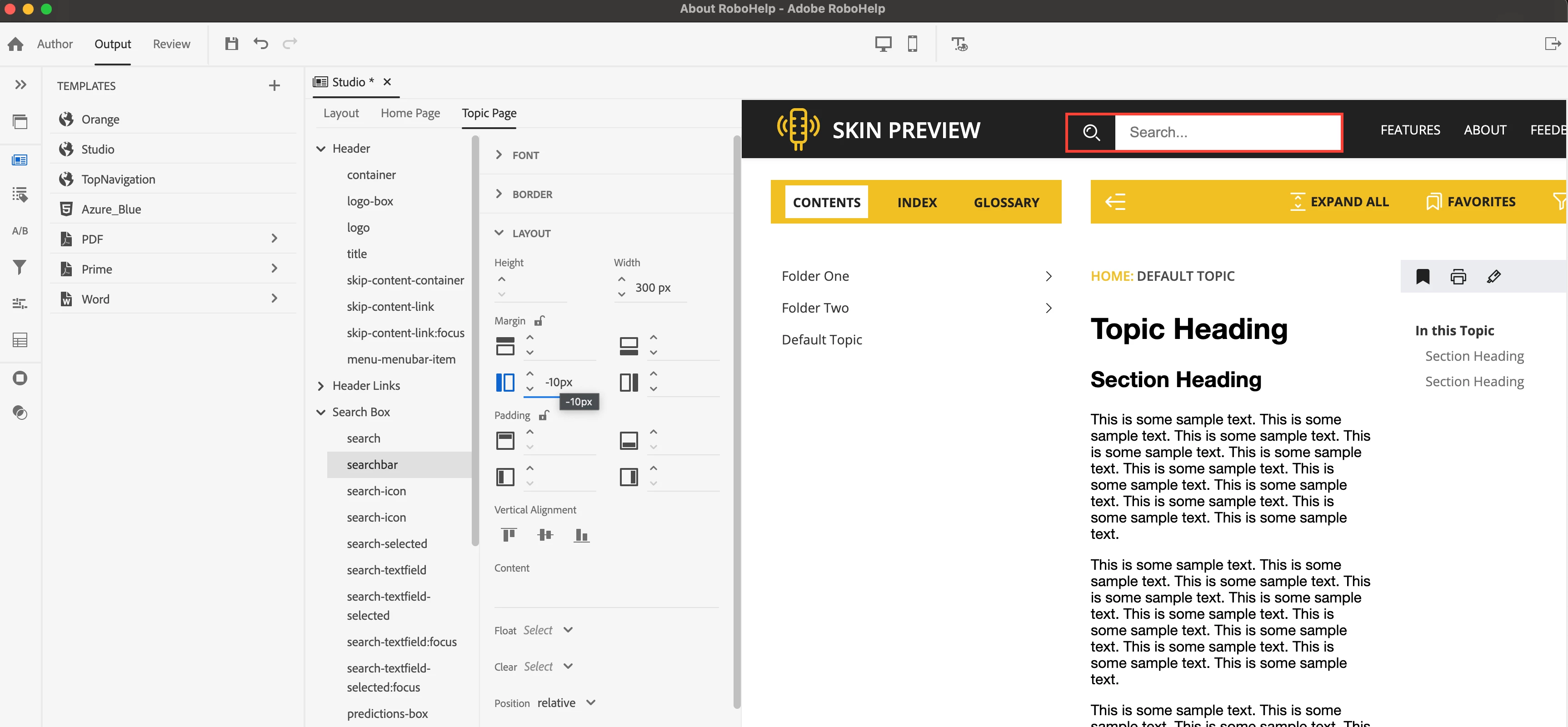 - I updated to RH's 2026.01.11 version to publish content using the Frameless Studio template. The Search bar now overlaps the Header title. How can I change the template settings so it doesn't overlap? In the earlier version, the search bar appeared only when the search icon was clicked, and the title would temporarily disappear. I want to replicate this behavior. I’ve attached ‘before’ and ‘after’ update images for reference.