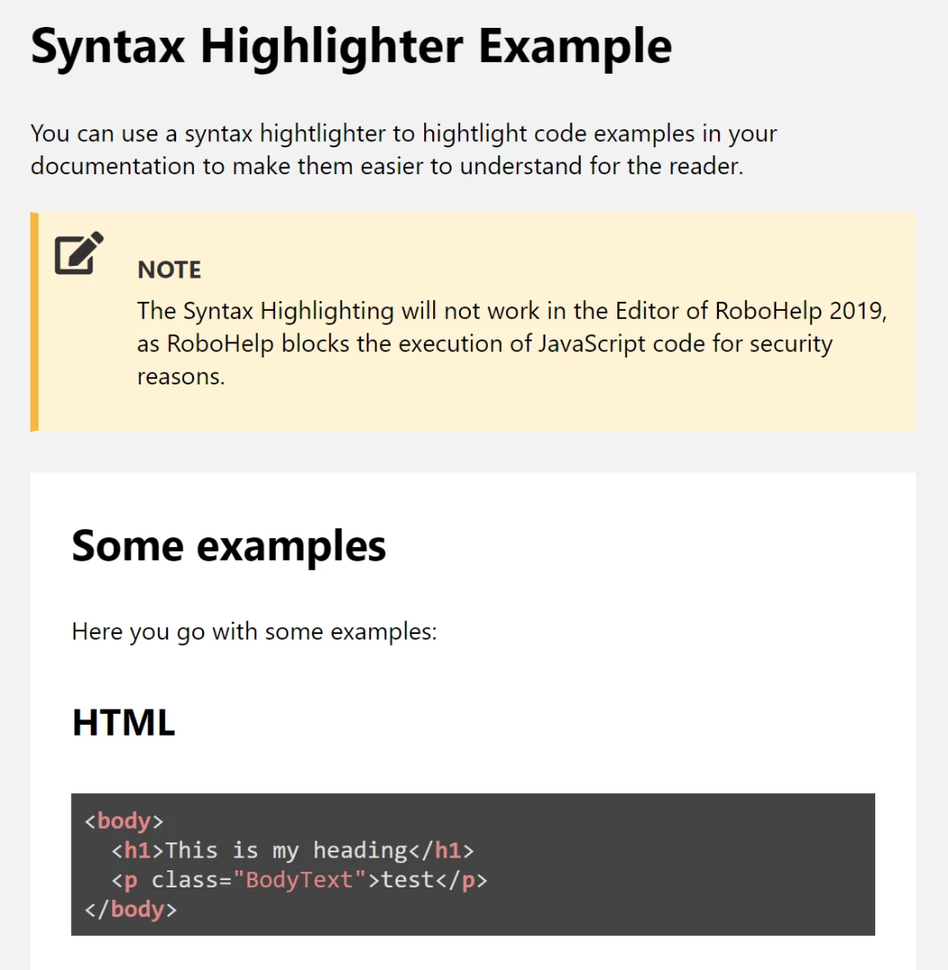 Note, that you will not see the highlighting in the RoboHelp editor, as RoboHelp will block the execution of JavaScripts for security reasons. But it will work fine in the published output.