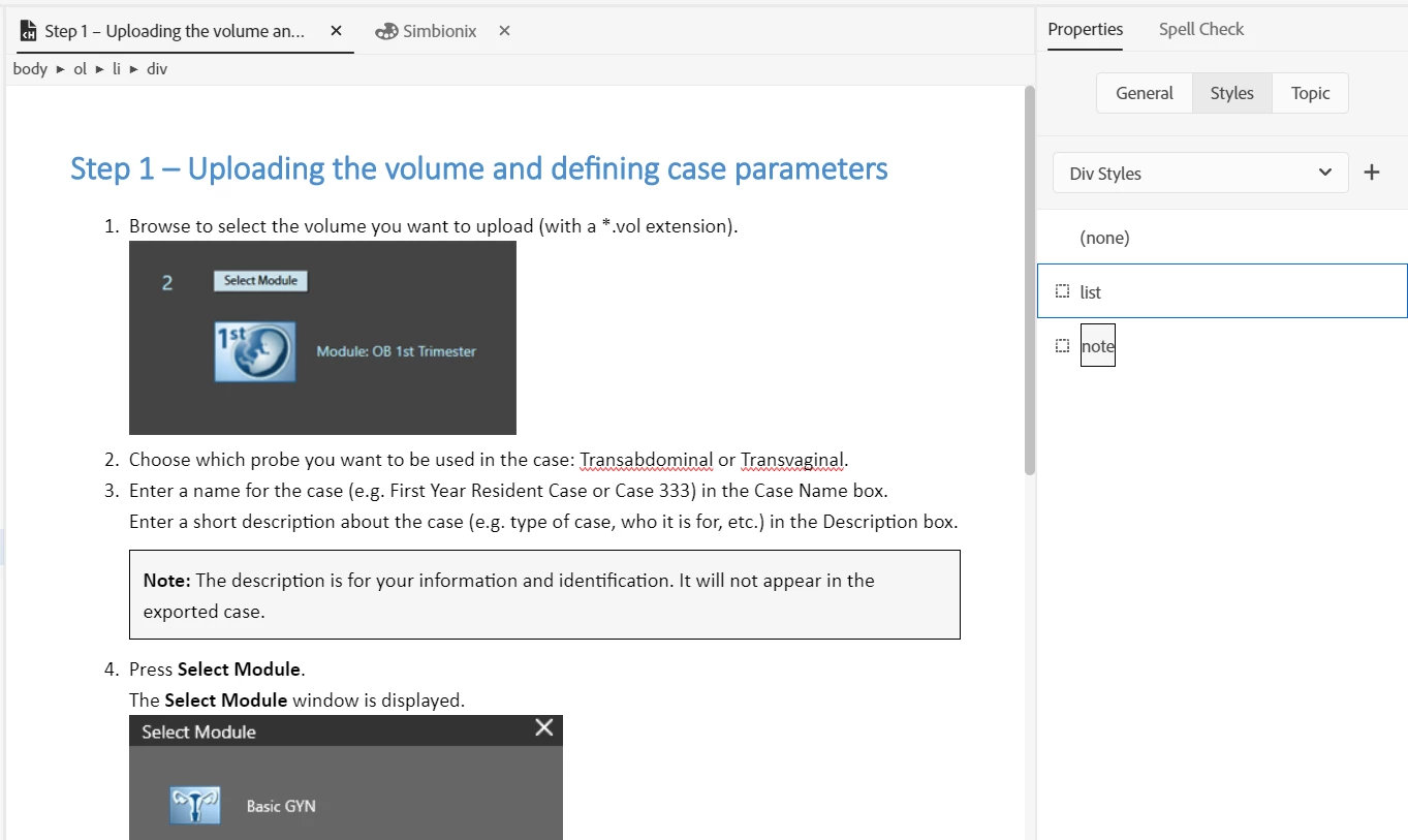 I created a new style that would indent under a numbered list or bulleted list item (used for aligning pictures under the text of the list item or the result text under the list item). I put the style in the Paragraph styles (p.list.continue) and Div Styles (div.list.continue). However, selecting it as a div style doesn't format as it should and as a paragraph style doesn't even appear in the Topic Style panel.