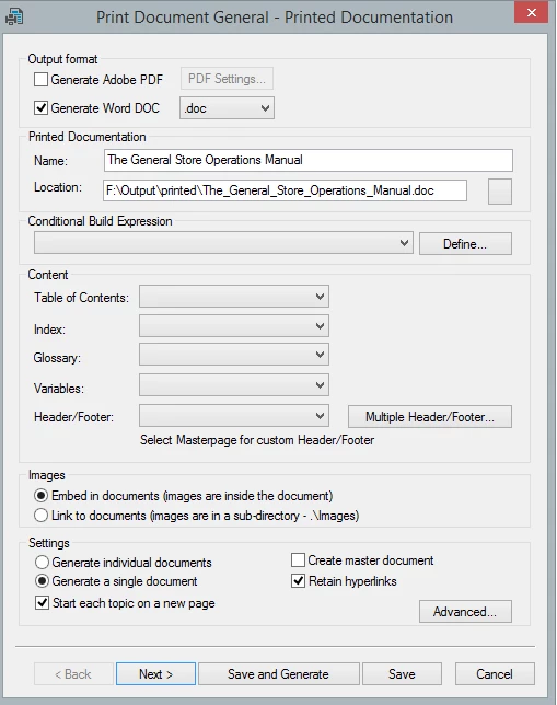 I'm pretty much a novice with RH, but have muddled through just about everything except the printed docs. I did create a PDF in a previous version of RH (7,8,9)...not sure. I have Word 2013 and have updated RH, but, here's what I get. When I select printed Documentation, I occasionally get a 'Parameter Incorrect' error, but clicking OK, goes right around it. In the first window, I get this: