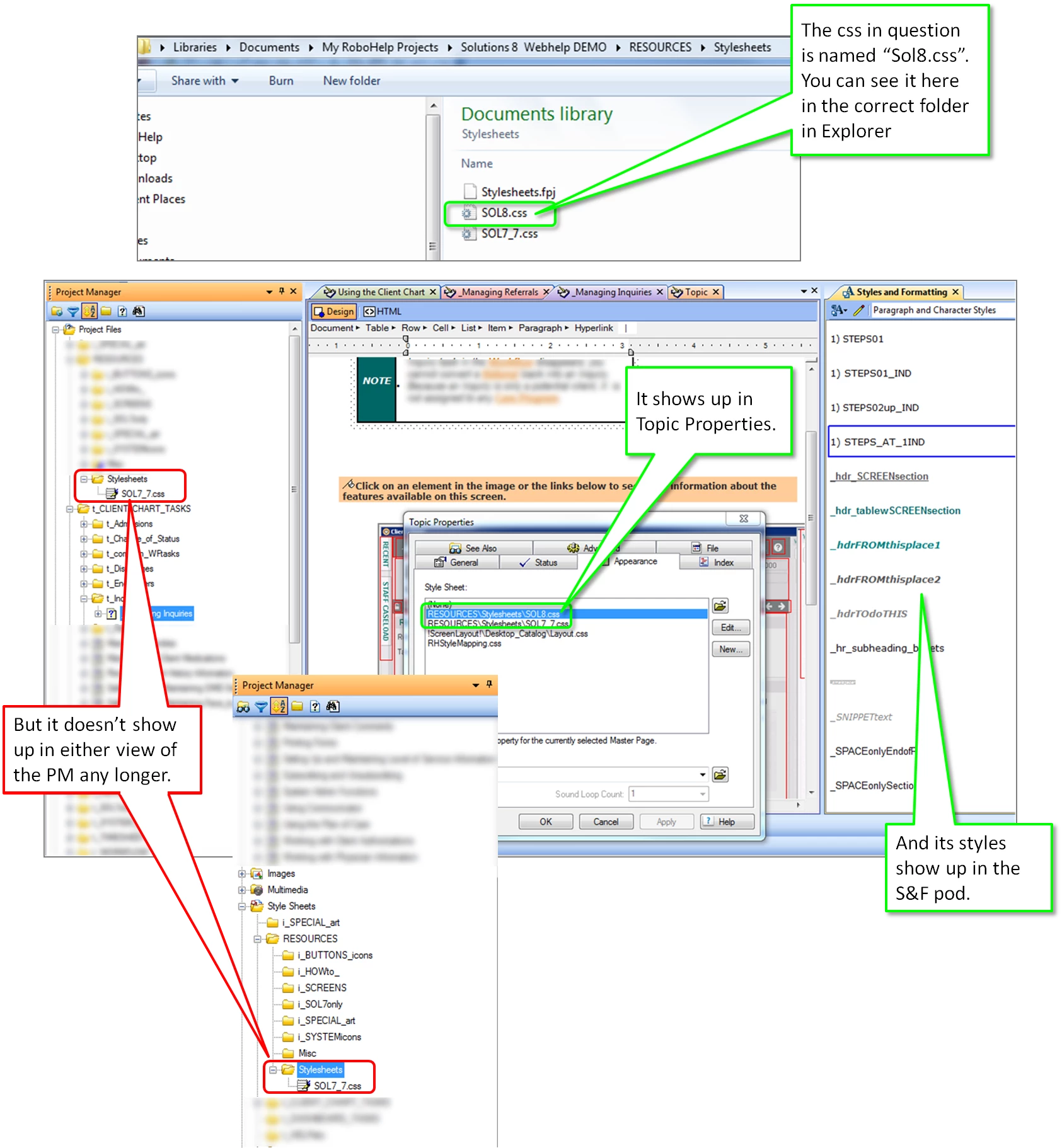 ok... next thing is, I created a new topic in the SS folder thinking if it acted like it did with the other topic, it would just drop the css into the same folder (this time Stylesheet where the new topic is)... but then it came up and asked me if i wanted to overwrite the existing Sol8. css.. so i said yes... and it still didn't show up in the SS folder.