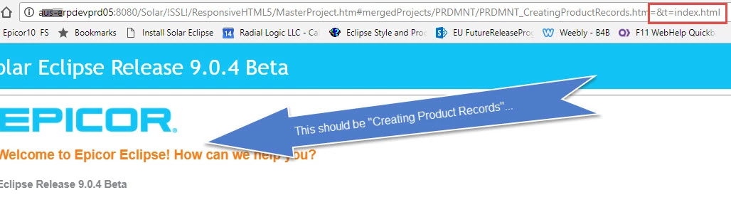 Alas, while the master online help displays, the system does not display the .htm file for the screen, but stops at the overall landing page from the master project. I know the files are there because I can drill into them through the TOC. Also, it seems to be tacking on this string at the end: =&t=index.html. Even after removing this appendage, the screen does not display but stops at the index.html file: