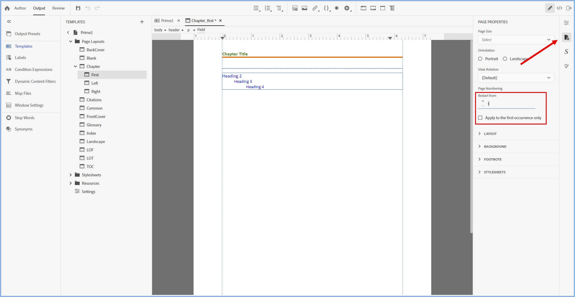 How to add diff page numbers for ToC and actual content in PDF in Robohelp?