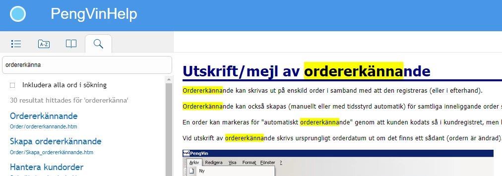 Searching for the word "Ordererkännande" (=order acknowledgement)