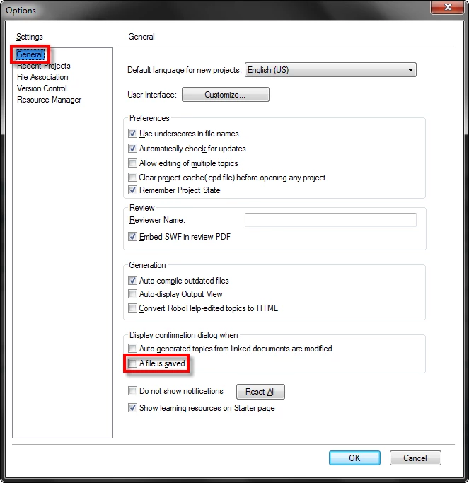 The instructions say to disable auto save, deselect "Save Without Prompt" in the General tab, but that option no longer appears in RH 2015. Is it now deselect the "Check in all files when closing the project"  in the Version Control tab??