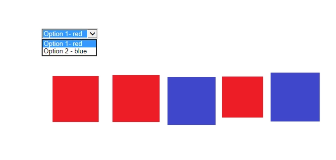 I added also a drop down menu. What I want to happen is that when I select the first option only the red objects are visible on the page. When I select the blue one - only the blue should be visible. The default value will be something like "select" and all the tiles/images will be visible. Here is also the code