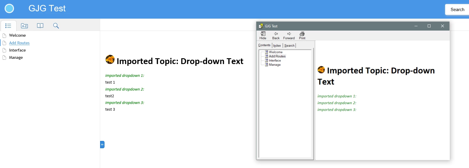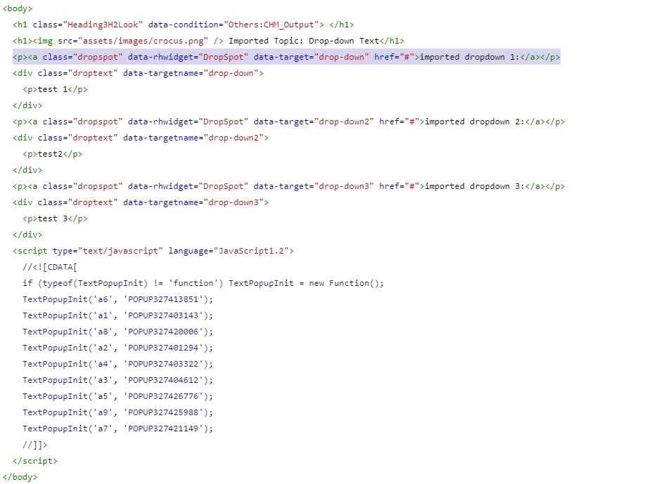 I upgraded a project to RH2020 and in the CHM, clicking the link to open drop-down text had mixed results. Some opened normally, some didn't open at all, and others opened the wrong text (the text for a different drop-down link). I recreated all of the drop-down text links in that topic and now none of them open at all.