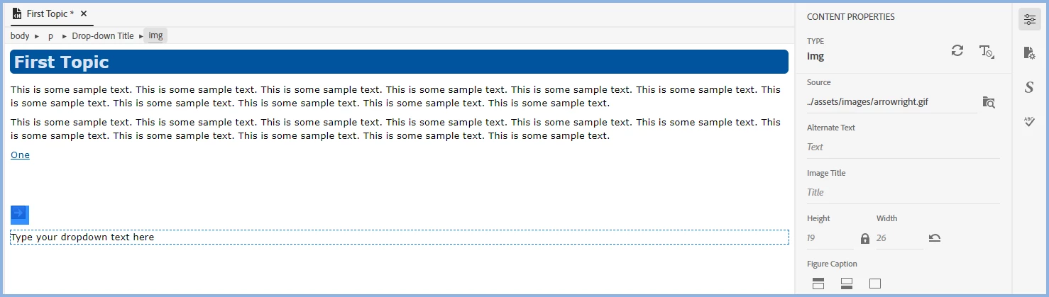 The example is a picture of what happens when you insert the image at the beginning of the "Type your dropdown text here" sentence, but I also tried it with the image after the text and that worked as well.