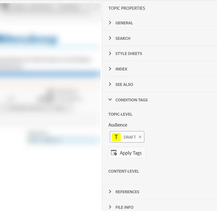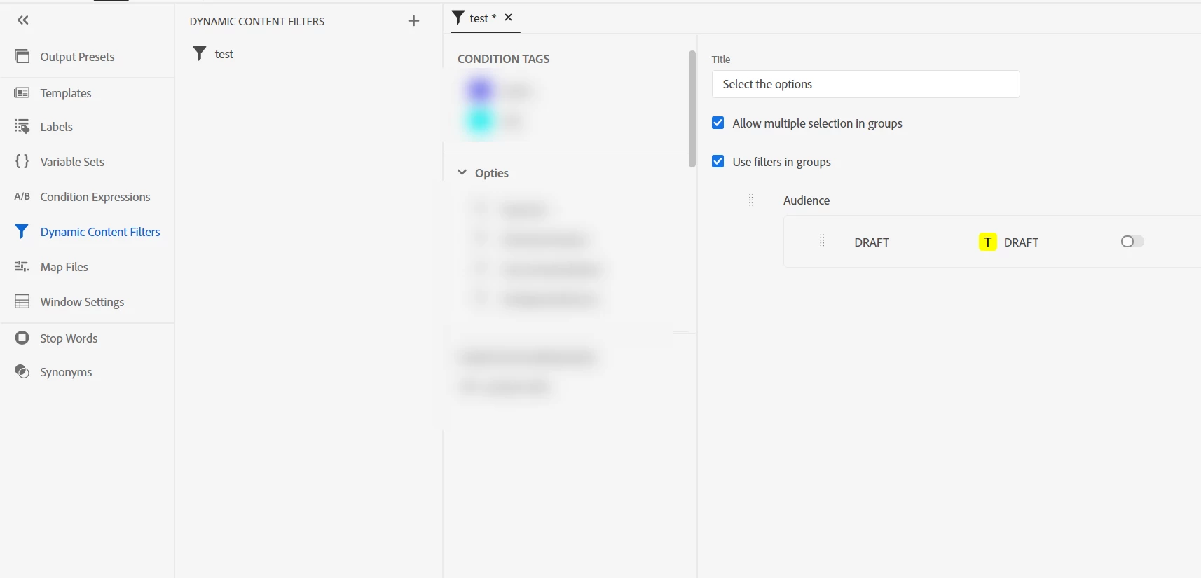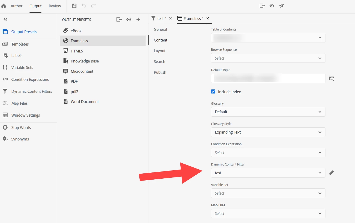 I have the RH 2022.0.346 and I am generating a Responsive HTML5 Output. I'm trying to insert a dynamic filter to give users the possibility (the project is a user manual whose topics are the individual features of one of our aplications) to select only yje topics related to installed features. To do this I created special condition tags which I then applied at both content and topic levels. I then created condition expressions that recalled those tags and then a dynamic filter that contains the previously created condition expressions.