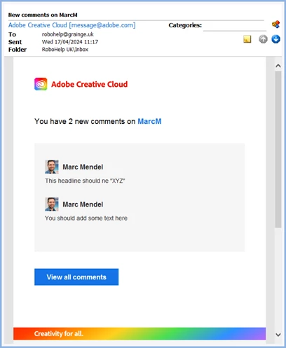 In "Screen_2" the e-mail notification that there are new responses to a review from Robohelp is showed there.