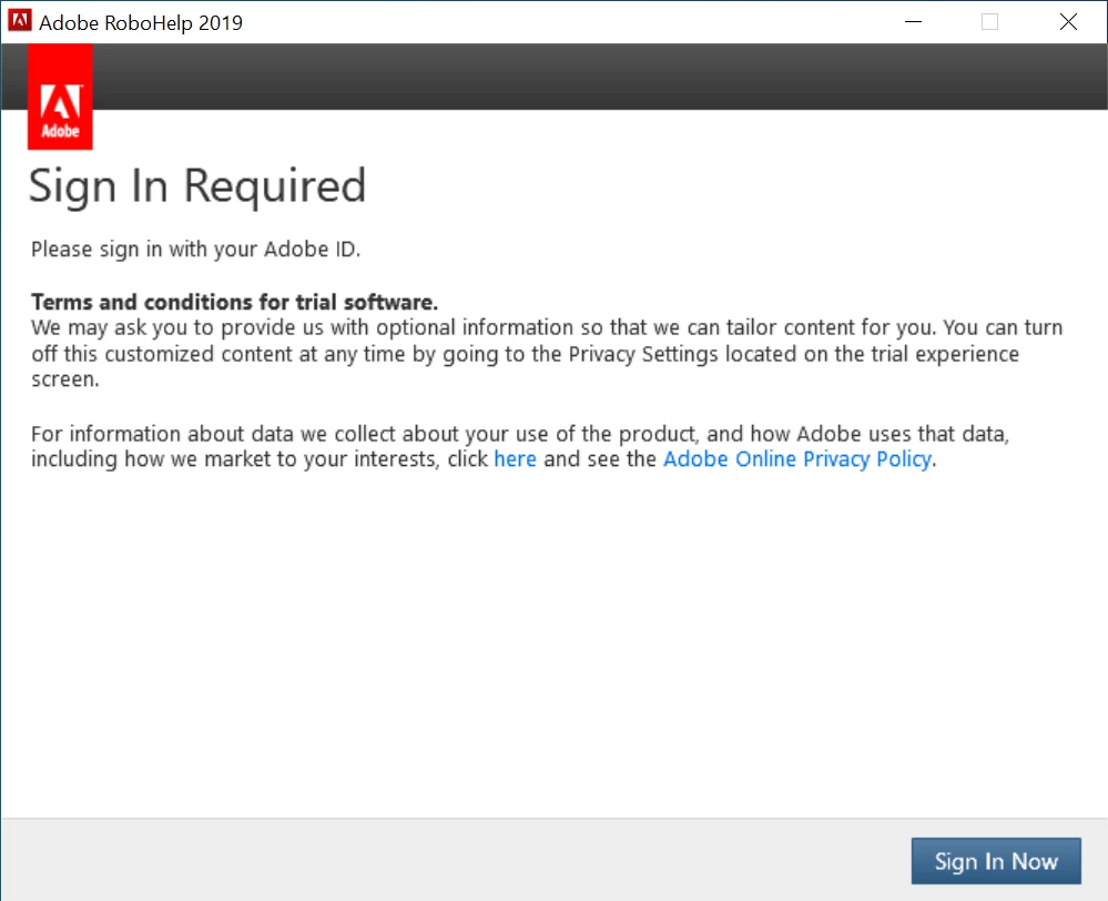 I am a new joinee at HCL Technologies. HCL Technologies is an Enterprise Business Client of Adobe. I have been told by my manager to download RoboHelp 2019 30-day trial version for training purposes. Once training is completed I will be provided with an activated License for the same.